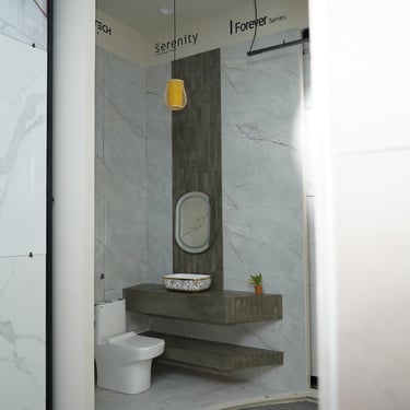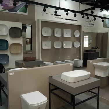 Visit our 2 lakh sq.ft. premium tile showroom featuring displays for bathrooms, kitchens, living rooms, parking and outdoor areas.